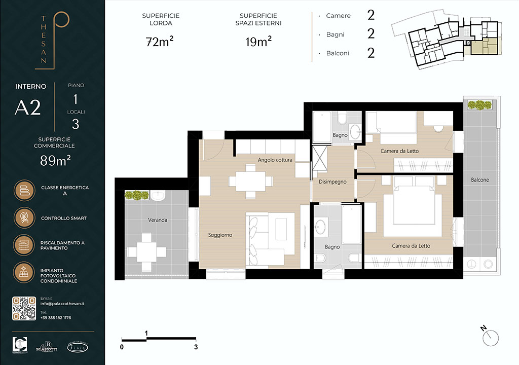 L’appartamento si trova a Palazzo Thesan in via Aremogna a Pescara; è situato al piano primo ed è un trilocale con soggiorno, angolo cottura, due camere da letto, di cui una matrimoniale, due bagni, una veranda e un balcone.