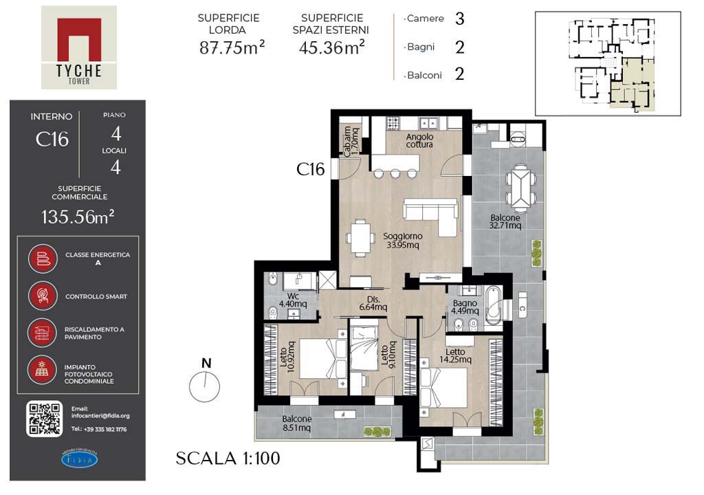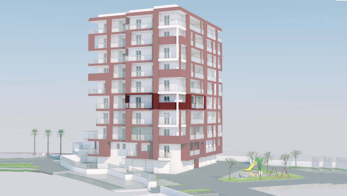 L’appartamento si trova nell’edificio TYCHE TOWER del Complesso Tyche Human Smart City a San Silvestro Spiaggia, a Pescara; è situato al piano quarto e si compone di soggiorno, angolo cottura, tre camere da letto, disimpegno, cabina armadio, un bagno, un wc e due balconi. Posto auto assegnato all’interno dell’area recintata condominiale