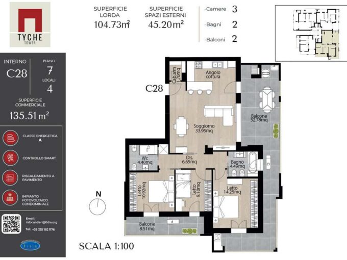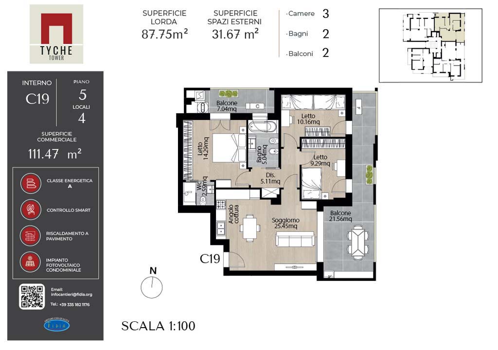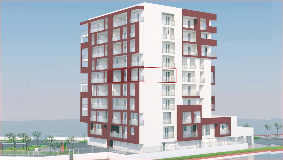 L’appartamento si trova nell’edificio TYCHE TOWER del Complesso Tyche Human Smart City a San Silvestro Spiaggia, a Pescara; è situato al piano quinto e si compone di soggiorno, angolo cottura, tre camere da letto, disimpegno, un bagno, un wc e due balconi. Posto auto assegnato all’interno dell’area recintata condominiale