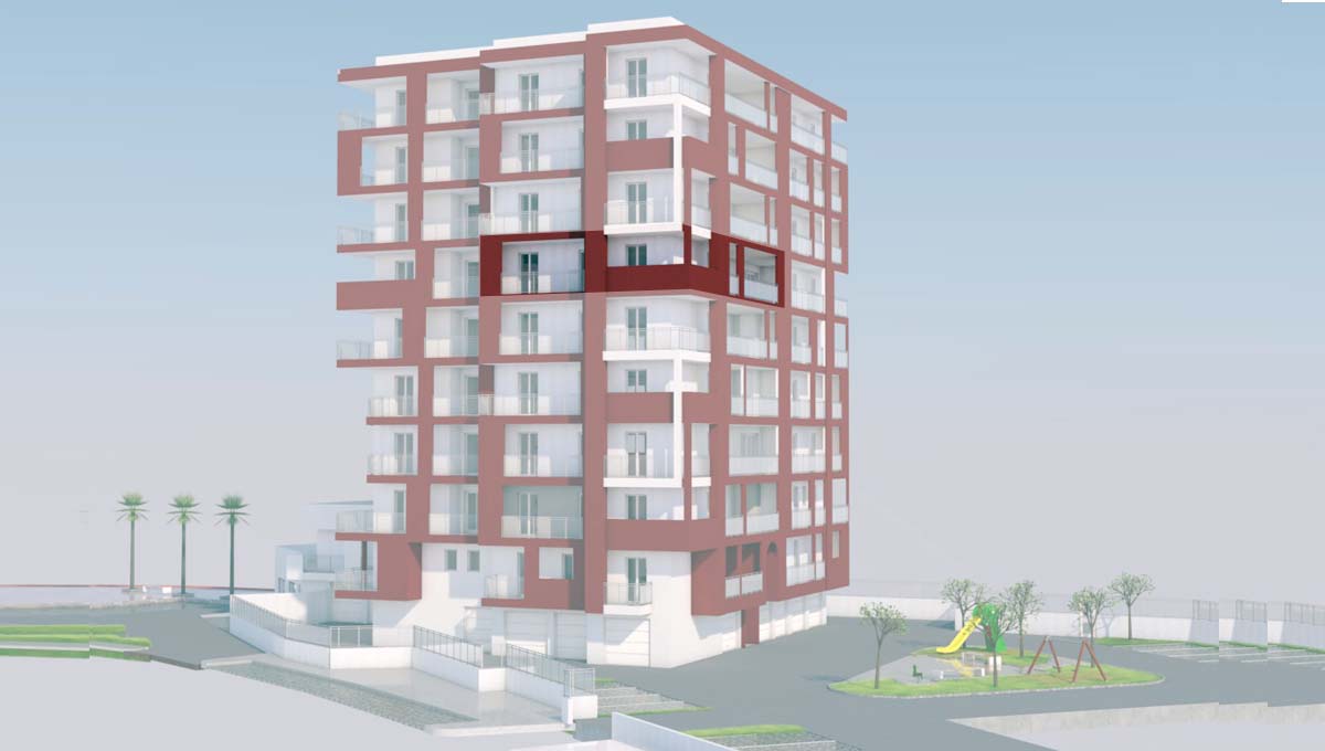 L’appartamento si trova nell’edificio TYCHE TOWER del Complesso Tyche Human Smart City a San Silvestro Spiaggia, a Pescara; è situato al piano sesto e si compone di soggiorno, angolo cottura, tre camere da letto, disimpegno, cabina armadio, un bagno, un wc e due balconi. Posto auto assegnato all’interno dell’area recintata condominiale
