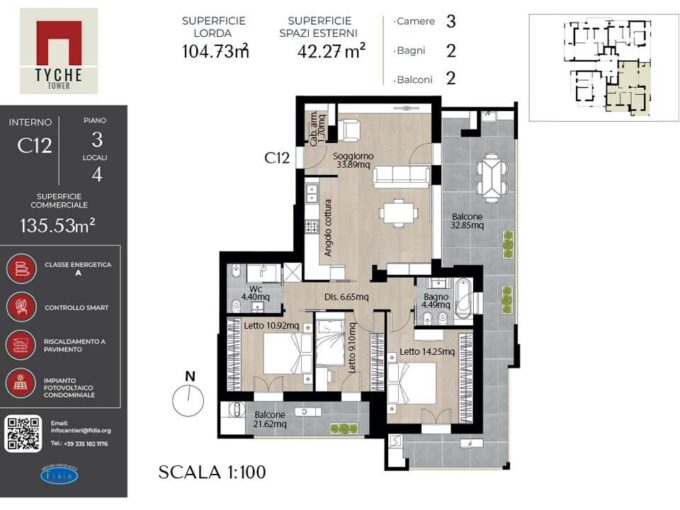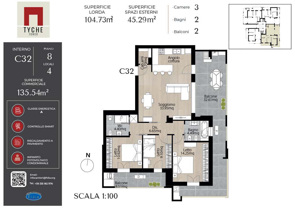 L’appartamento si trova nell’edificio TYCHE TOWER del Complesso Tyche Human Smart City a San Silvestro Spiaggia, a Pescara; è situato al piano ottavo e si compone di soggiorno, angolo cottura, tre camere da letto, disimpegno, cabina armadio, un bagno, un wc e due balconi. L’appartamento dispone di un posto auto assegnato all’interno dell’area recintata condominiale e un posto auto di proprietà.
