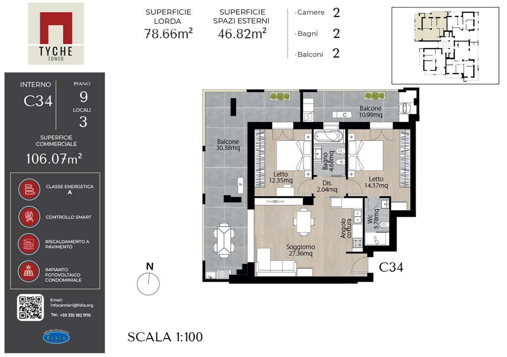 L’appartamento si trova nell’edificio TYCHE TOWER del Complesso Tyche Human Smart City a San Silvestro Spiaggia, a Pescara; è situato al piano nono e compone di soggiorno, angolo cottura, due camere da letto, disimpegno, un bagno, un wc e due balconi. L’appartamento dispone di un posto auto assegnato all’interno dell’area recintata condominiale e un posto auto di proprietà.