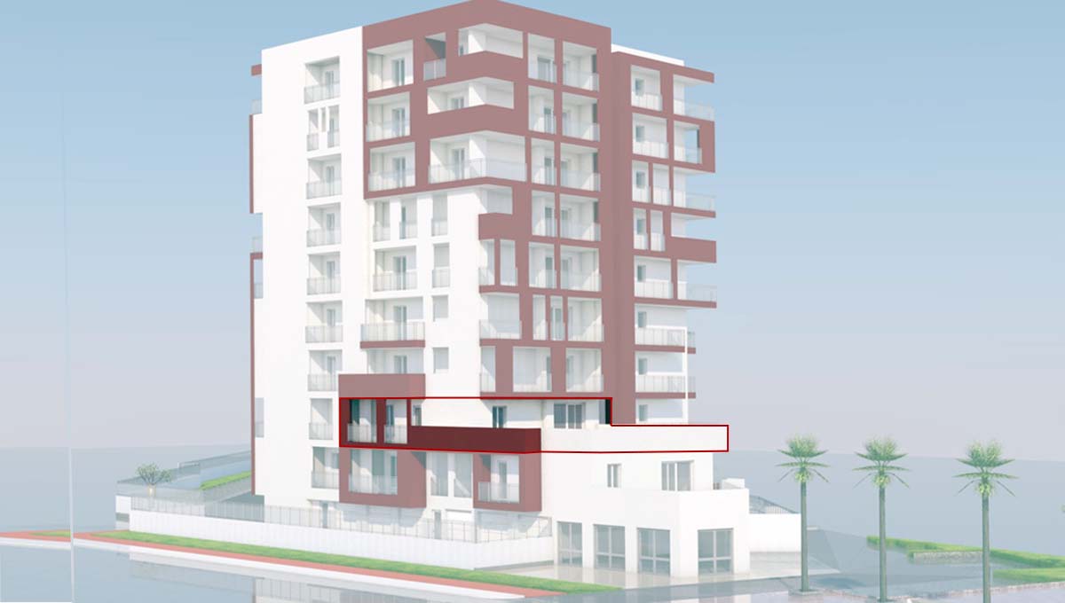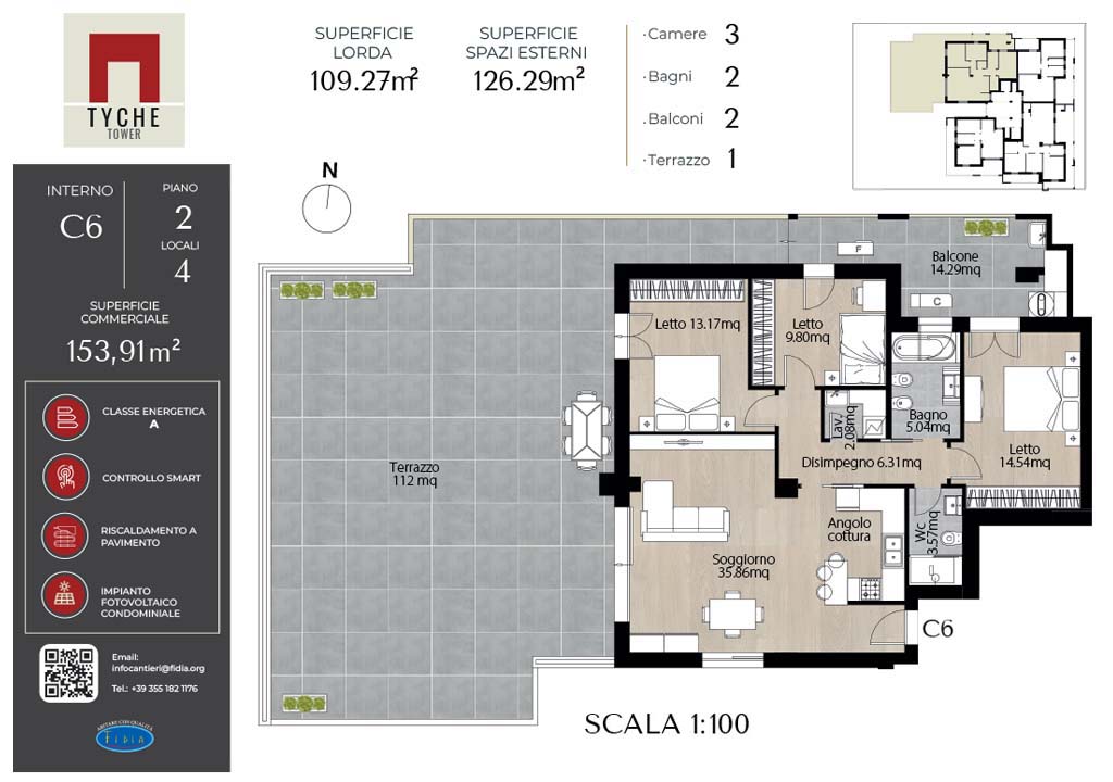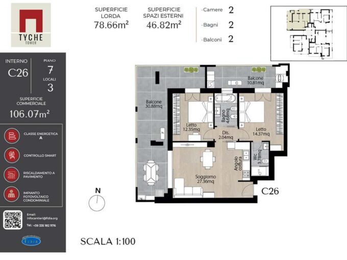 L’appartamento si trova nell’edificio TYCHE TOWER del Complesso Tyche Human Smart City a San Silvestro Spiaggia, a Pescara; è situato al piano secondo e si compone di soggiorno, angolo cottura, tre camere da letto, disimpegno, un bagno, un Wc, un lavatoio, un balcone e un terrazzo. L’appartamento dispone di un posto auto assegnato all’interno dell’area recintata condominiale e un posto auto di proprietà.