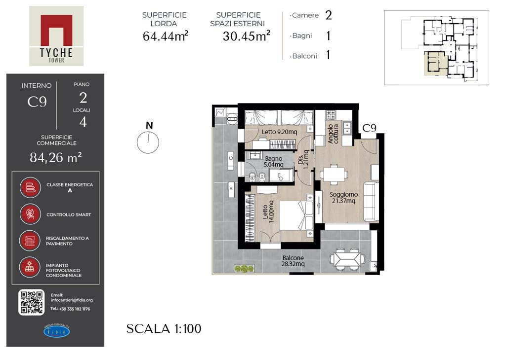 L’appartamento si trova nell’edificio TYCHE TOWER del Complesso Tyche Human Smart City a San Silvestro Spiaggia, a Pescara; è situato al piano secondo e si compone di soggiorno, angolo cottura, due camere da letto, disimpegno, un bagno, e un balcone. Posto auto assegnato all’interno dell’area recintata condominiale